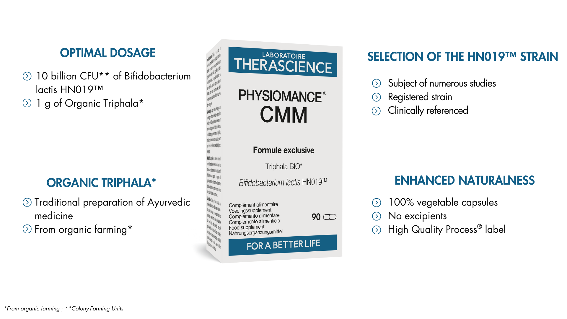 PHYSIOMANCE® CMM ist eine synergetische und innovative Formel, die den probiotischen Stamm Bifidobacterium lactis HN019™ in einer Dosierung von 10 Milliarden KBE** mit einem 1 g Bio-Triphala-Extrakt* kombiniert. Der Stamm HN019™ ist klinisch dokumentiert zeichnet sich durch ein ausgezeichnetes Verträglichkeitsprofil aus. Das Bio-Triphala*, eine traditionelle ayurvedische Mischung aus drei Früchten — Amla, Bibhitaki und Haritaki — wird hier in Form von zertifiziertem Bio-Pulver ohne Hilfsstoffe verwendet, für maximale Natürlichkeit. Die Formel profitiert von einer optimalen Bioverfügbarkeit dank magensäureresistenter DR Caps™, 100 % pflanzlich, die den Schutz der Wirkstoffe gewährleisten.