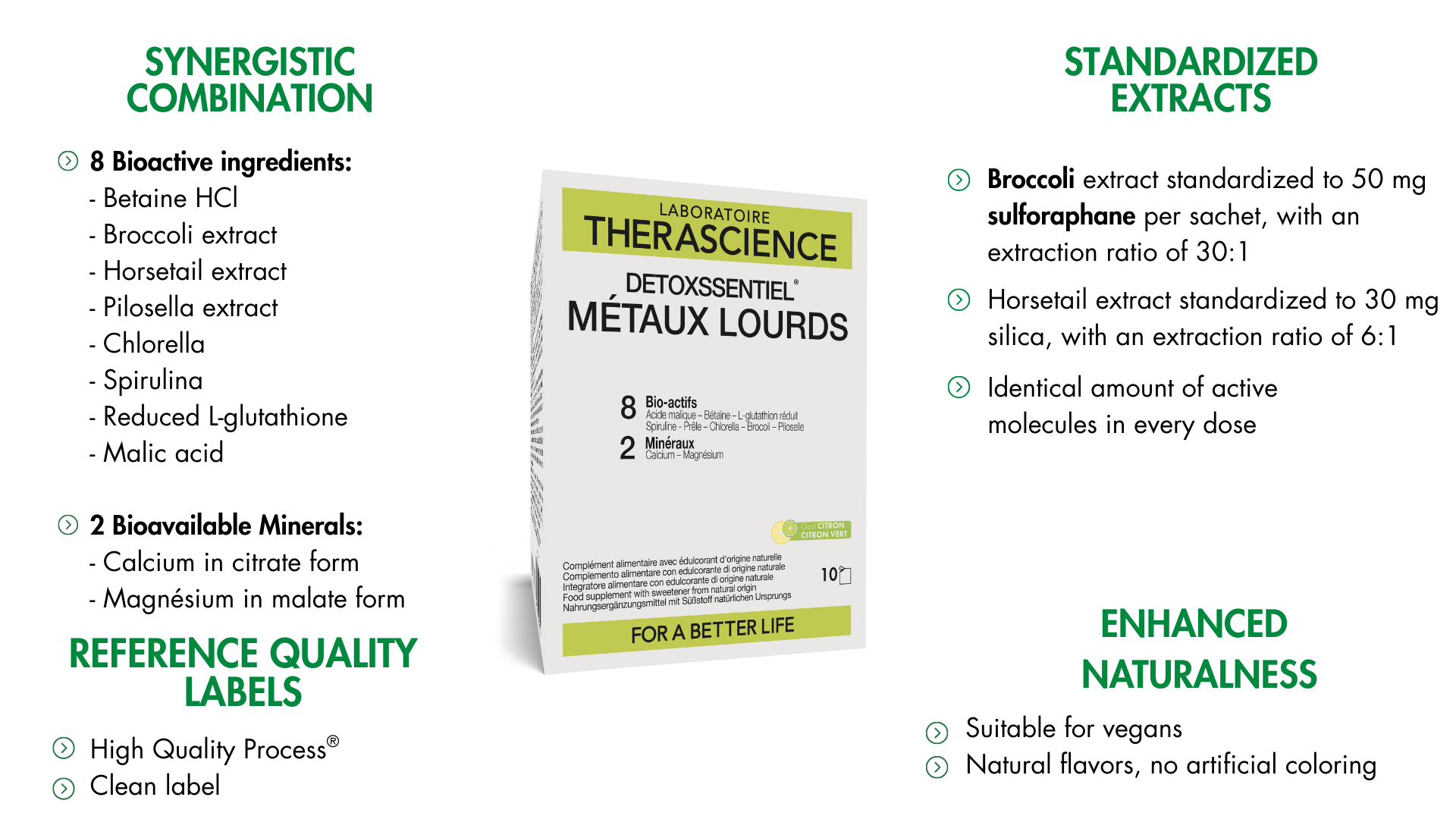 DETOXSSENTIEL® Métaux Lourds spiegelt das Engagement des Laboratoire THERASCIENCE für mehr Natürlichkeit und verantwortungsvolle Formulierungen wider. Dieses Nahrungsergänzungsmittel ist ohne zugesetzten Zucker, ohne Farbstoffe und ausschließlich mit natürlichen Aromen formuliert. Es enthält keine gluten- oder laktosehaltigen Zutaten und ist vollständig für vegetarische und vegane Ernährung geeignet. Das in der Formel verwendete L-Cystein ist natürlich, pflanzenbasiert und wird durch Fermentation gewonnen – ein umweltfreundlicher Prozess.