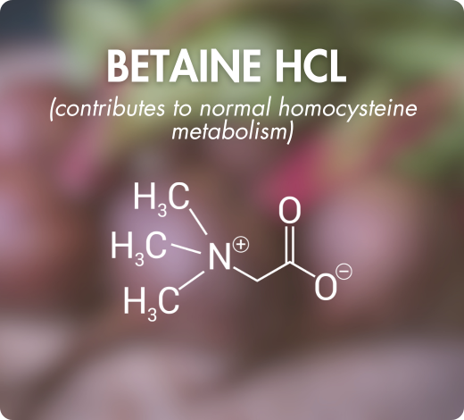 - - Betaine-HCl trägt zum normalen Homocystein-Stoffwechsel bei;