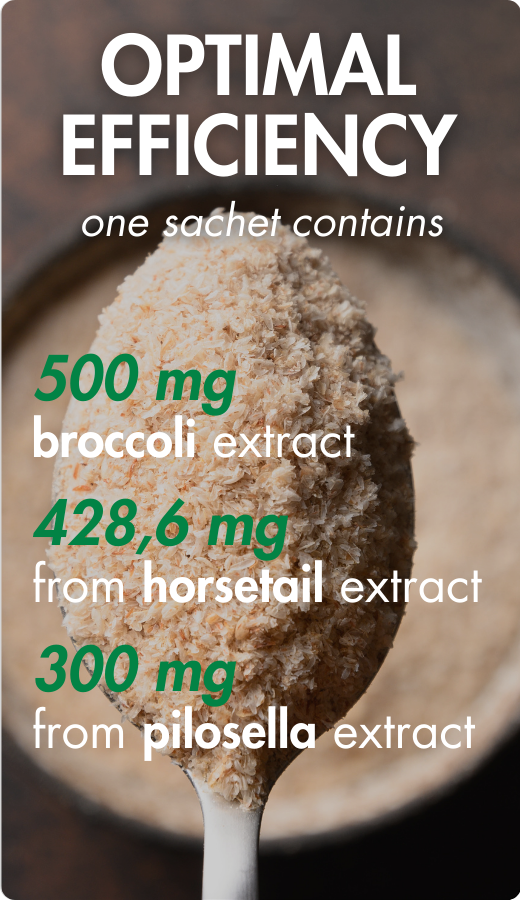 Brokkoliextrakt, reduziertes Glutathion, Spirulina und Apfelsäure wurden in zahlreichen wissenschaftlichen Studien untersucht, und ihre Wirkmechanismen sind in der Literatur gut dokumentiert. Allerdings wurden für diese Wirkstoffe bisher keine gesundheitsbezogenen Angaben gemäß europäischer Gesetzgebung offiziell anerkannt. Obwohl keine spezifischen Vorteile offiziell bestätigt sind, stoßen diese Inhaltsstoffe auf zunehmendes Interesse und eröffnen vielversprechende Perspektiven, die weiter erforscht werden sollten.