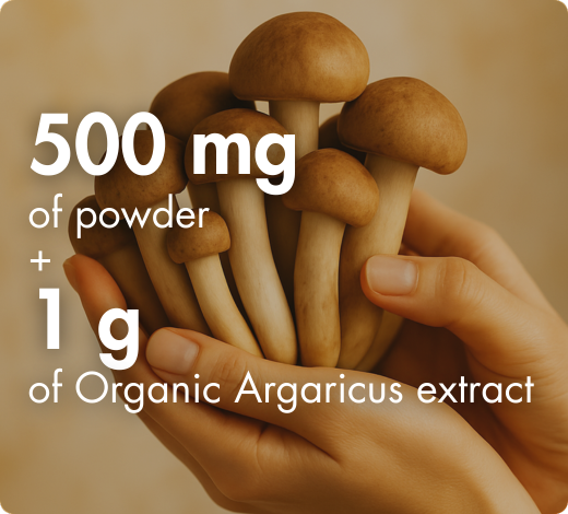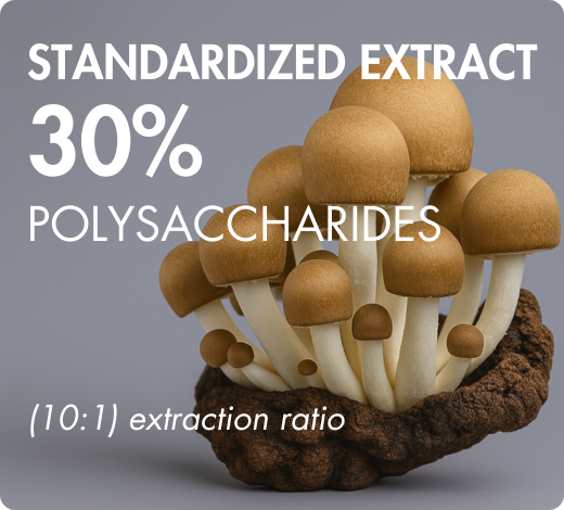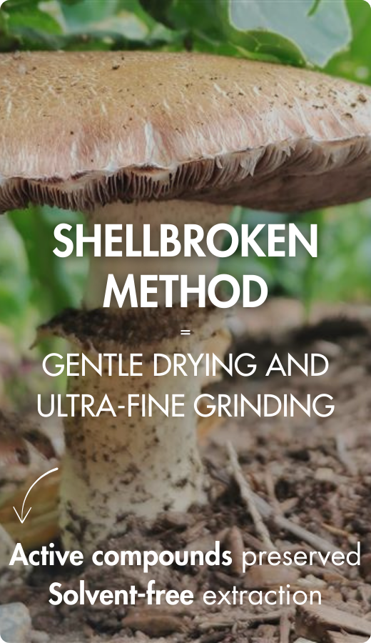 Nach der Trocknung werden die Fruchtkörper mit der "Shellbroken"-Methode zu einem ultrafeinen Pulver vermahlen. Diese Technik bricht die Zellwände der Pilze mechanisch auf, setzt alle aktiven Verbindungen frei und verbessert deren Bioverfügbarkeit erheblich.