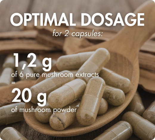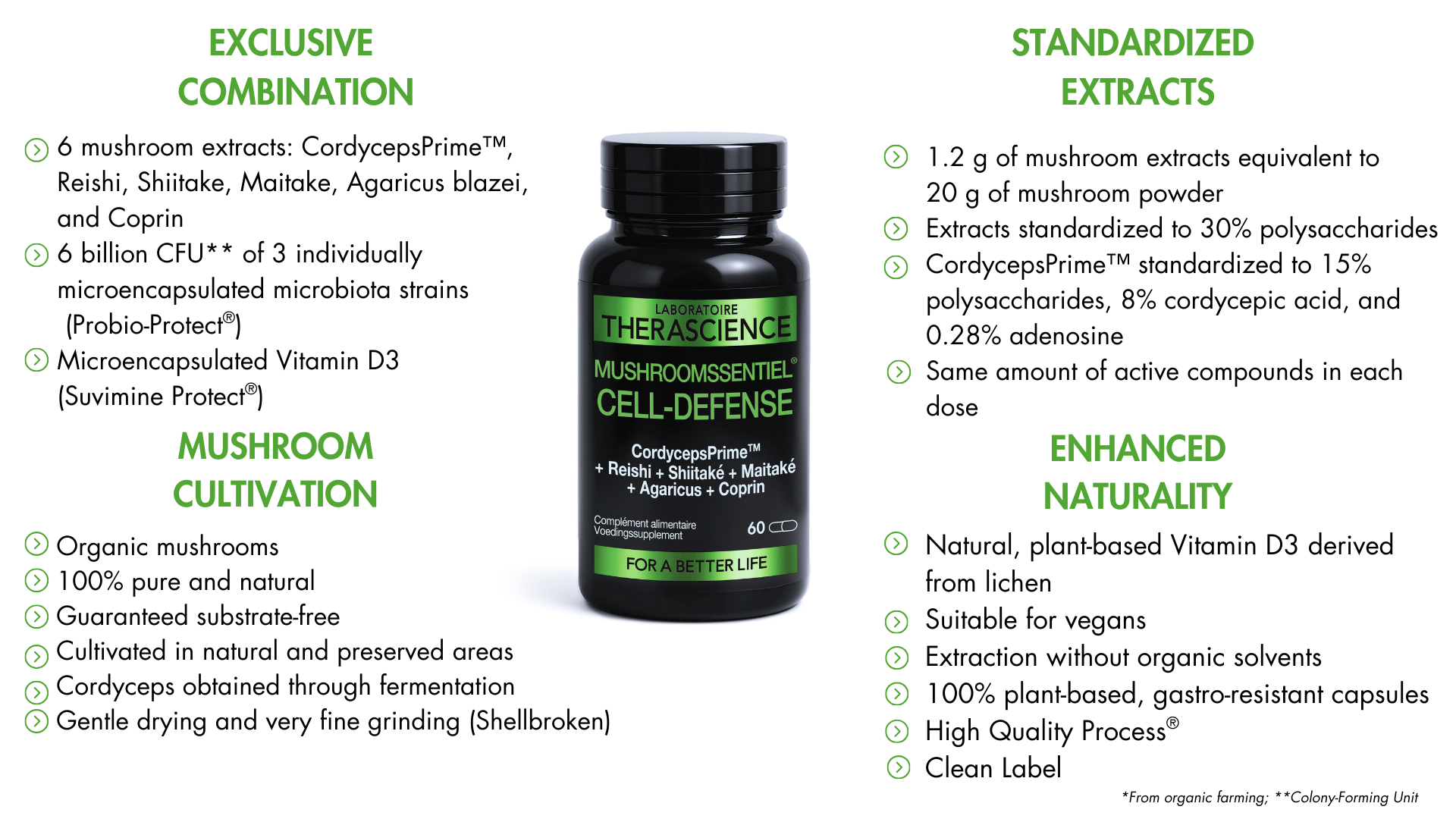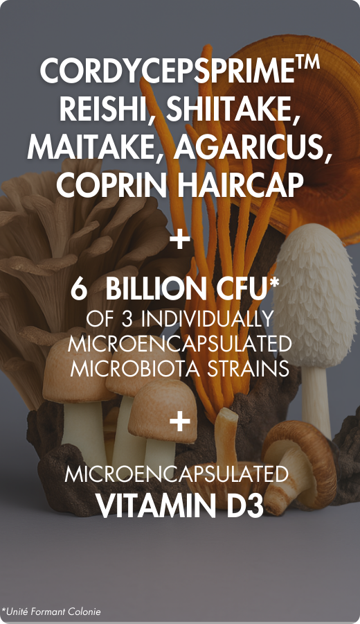 - Einzigartige Kombination: 6 BIO*-Pilzextrakte (Cordyceps CS-4 CordycepsPrimeTM, Reishi, Shiitake, Maitake, Agaricus blazei und Coprin-Haarhut) + 3 individuell mikroverkapselte Mikrobiotastämme (Probio-Protect®) und 1000% der Referenzaufnahme an natürlichem, pflanzlichem Vitamin D3, mikroverkapselt (Suvimine Protect®)