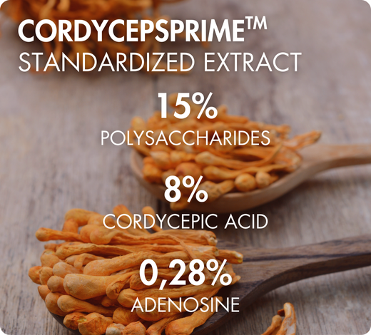- CordycepsPrimeTM: Registrierter Myzelextrakt von Cordyceps sinensis CS-4 aus Fermentation, standardisiert auf 15% Polysaccharide, 8% Cordycepssäure und 0,28% Adenosin, klinisch nachgewiesene Wirksamkeit