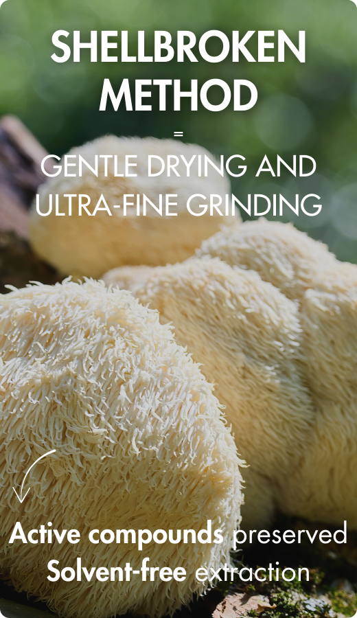Hericium-Pulver enthält das vollständige Nährstoffprofil des Pilzes: Ballaststoffe, Polysaccharide einschließlich Beta-Glucanen, Terpene, Ganodernsäuren, Proteine, Enzyme, Mineralstoffe und weitere Mikronährstoffe, die das sogenannte „Totum“ des Pilzes bilden und synergetisch wirken.