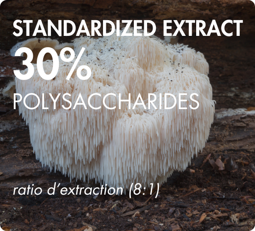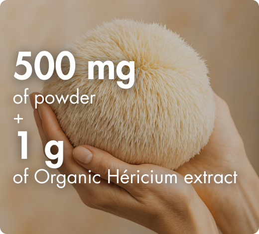 MUSHROOMSSENTIEL® Hericium kombiniert Hericium-Pulver mit einem auf aktive Moleküle standardisierten Extrakt und bietet damit einen kraftvollen und umfassenden synergetischen Ansatz. Beide Komponenten bringen spezifische und sich ergänzende Vorteile.