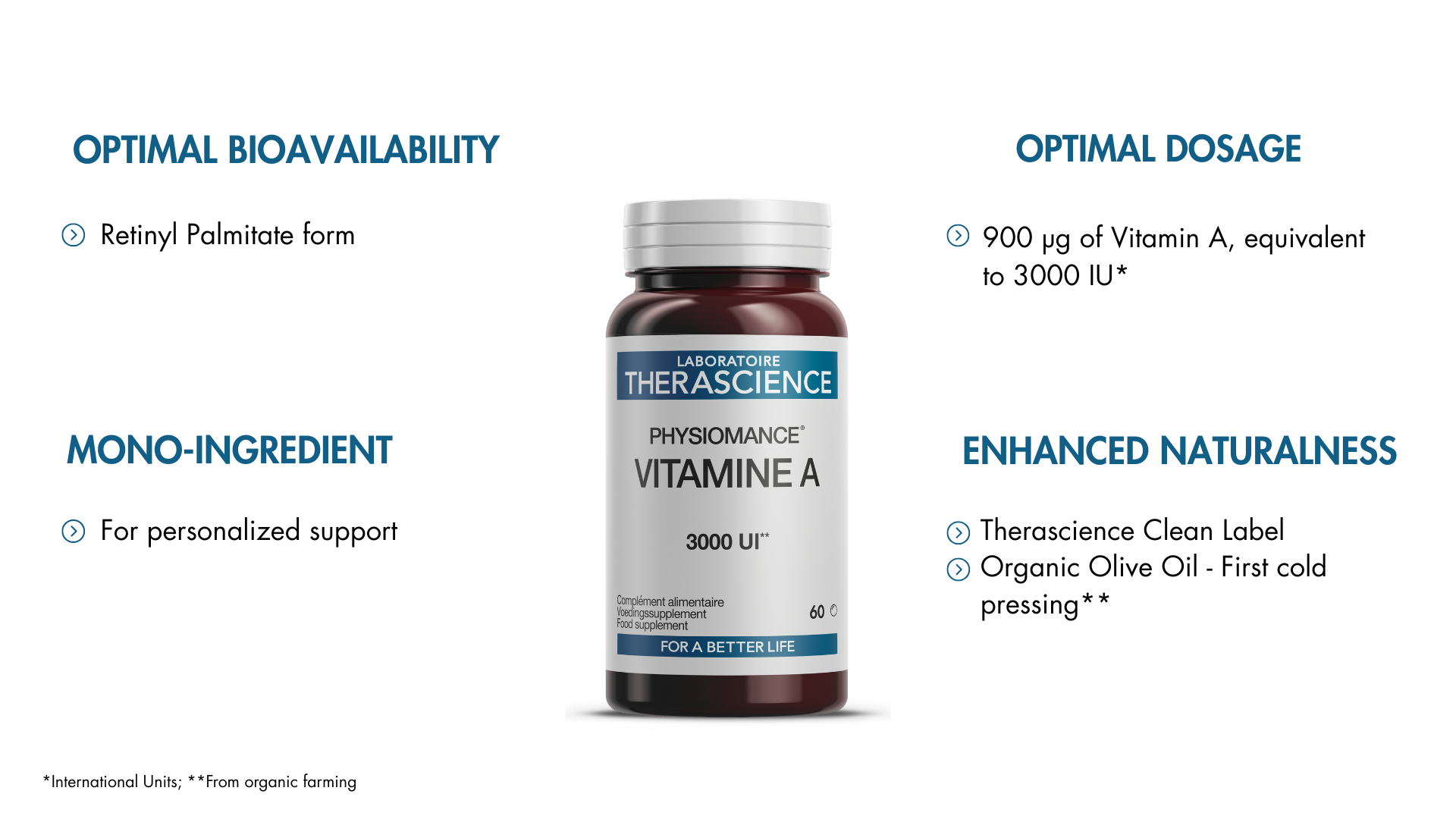 PHYSIOMANCE® Vitamin A spiegelt das Engagement des Laboratoires THERASCIENCE für mehr Natürlichkeit und verantwortungsvolle Formulierung wider. Dieses Nahrungsergänzungsmittel wird ohne zugesetzten Zucker, ohne Farbstoffe und ausschließlich mit natürlichen Aromen hergestellt. Es enthält keine kontroversen Hilfsstoffe und ist frei von gluten- und laktosehaltigen Bestandteilen.