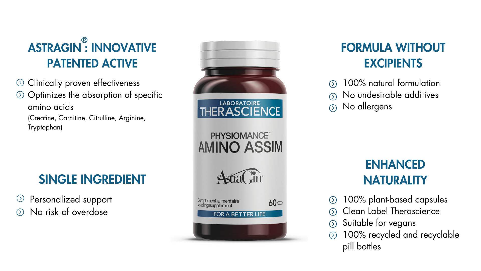 Combined with the choice of a 100% natural origin active ingredient, PHYSIOMANCE® Amino Assim is a formula with enhanced naturalness.
