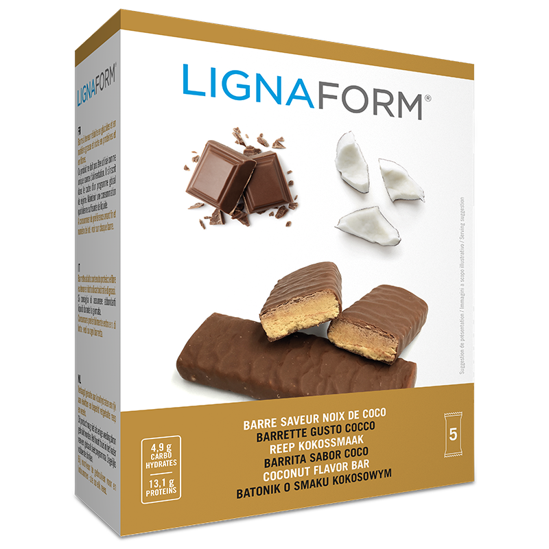 Milk proteins, polydextrose syrup, oligo-fructose syrup, milk chocolate 16% (sugar, cocoa butter, full cream milk powder, cocoa paste, emulsifier: lecithin of soya, natural vanilla flavouring), wheat proteins, sunflower oil, emulsifiers: soya lecithin and sucrose esters of fatty acids, stabilizers: glycerol and sorbitol, natural coconut flavouring 0,7%, salt.