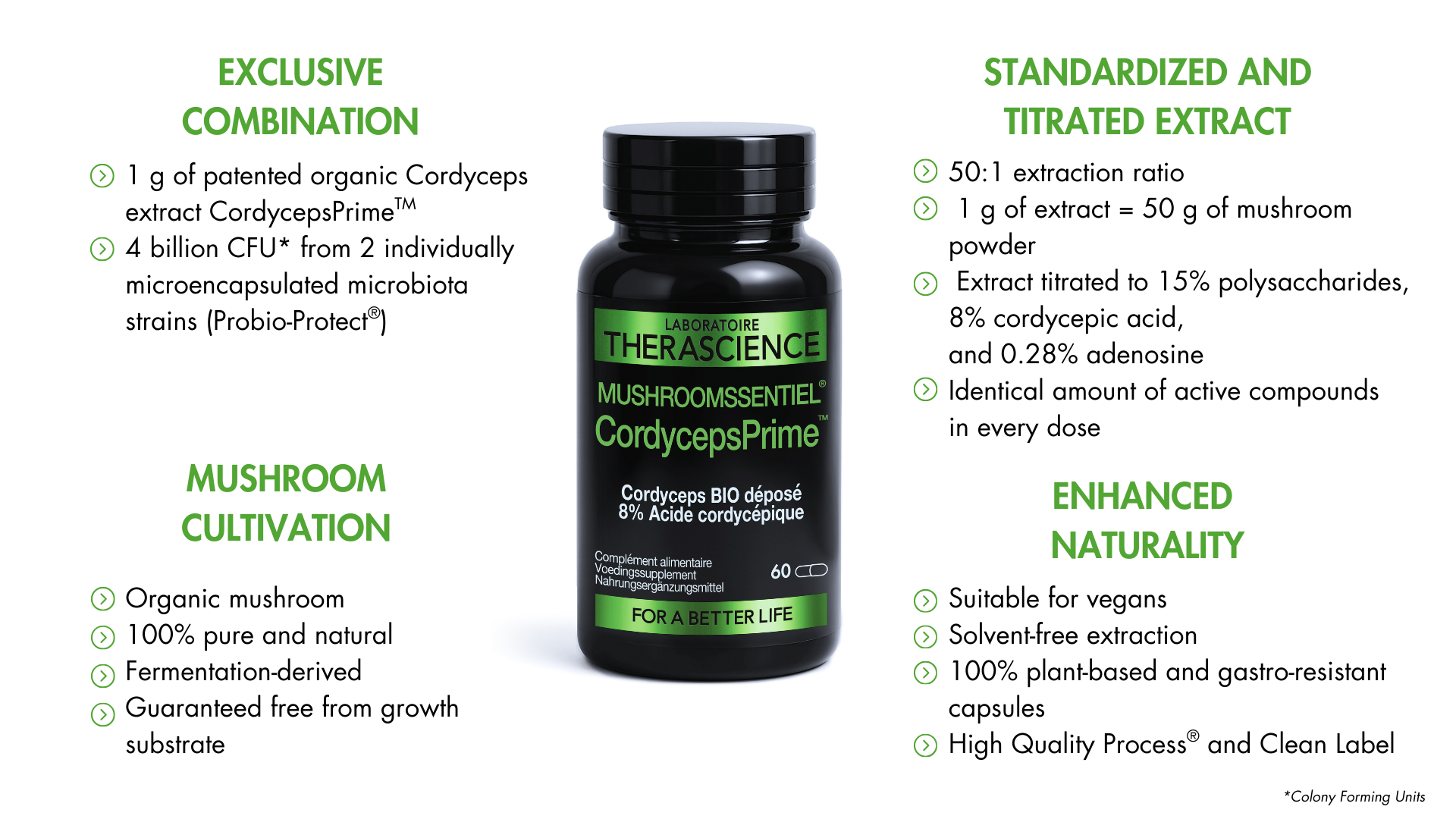 Although cordyceps is an essential mushroom, not all extracts are equal. That is why the THERASCIENCE Laboratory has selected the standardized extract of Cordyceps (Cordyceps sinensis) CS‑4 BIO: CordycepsPrimeTM.