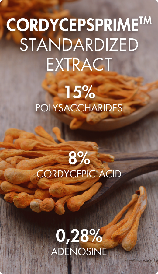 Our standardized extract offers consistent quality, thanks to a rigorous manufacturing process. Choosing CordycepsPrime™ means opting for a formula that meets the most demanding scientific standards and a premium mushroom thanks to a highly dosed extract. An ideal solution to fully benefit from the benefits of cordyceps.