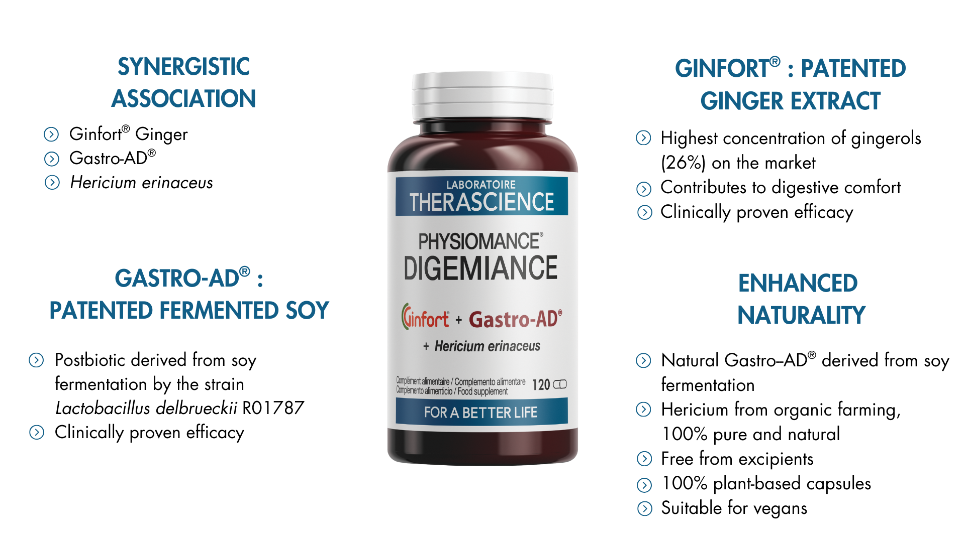 PHYSIOMANCE® Digemiance also meets the standards of the High Quality Process®, and the formula contains no gluten- or lactose-based ingredients, ensuring optimal tolerance. Entirely plant-based, the formula is suitable for vegans, while meeting a growing demand for natural, safe, traceable solutions that respect digestive physiology.
