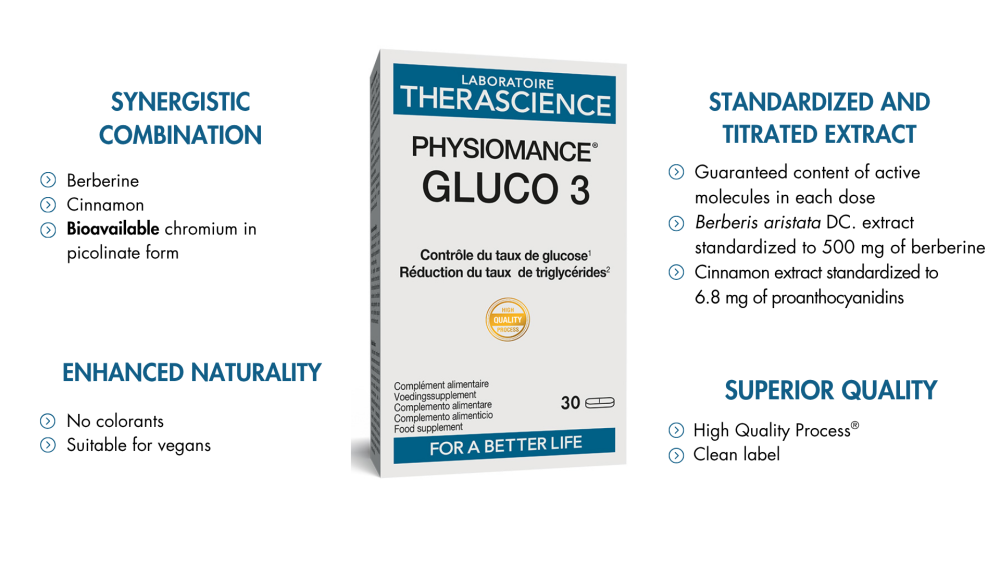 PHYSIOMANCE® GLUCO 3 is based on a synergistic combination of three rigorously selected active ingredients: 515.5 mg of Berberis aristata DC. extract standardized to 500 mg berberine, 34 mg of cinnamon extract standardized to 6.8 mg proanthocyanidins, and 250 µg of chromium in picolinate form, a highly absorbable form known for its optimal bioavailability.