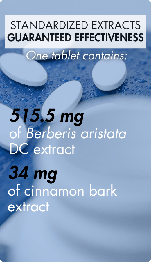 The extract of Berberis aristata DC is standardized to 97% berberine, representing 500 mg of berberine per daily dose.