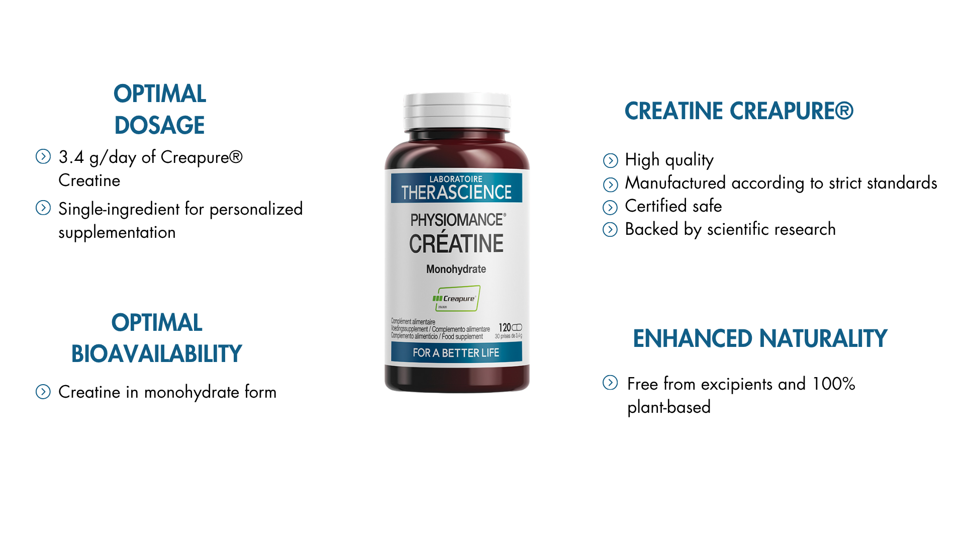 PHYSIOMANCE® Creatine is formulated with Creapure® creatine monohydrate, a premium-quality ingredient manufactured in Europe under strict standards and supported by scientific research. PHYSIOMANCE® Creatine is a single-ingredient formula for personalized supplementation. With an optimal dose of 3.4 g for 4 capsules per day, this ultra-pure creatine is guaranteed free from the risk of vitamin or mineral overdose. Offered as 100% vegetable capsules without excipients, flavorings, sweeteners, or sugars, PHYSIOMANCE® Creatine perfectly adapts to your needs.