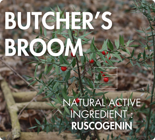 Butcher’s broom (Ruscus aculeatus), also known as “knee holly,” is a perennial plant that grows in Mediterranean undergrowth and shaded areas of Europe. Easily recognized by its small, stiff leaves and bright red berries, it has been used since antiquity in traditional medicine for its rhizomes—its underground roots—which concentrate a major natural active compound: ruscogenin. Butcher’s broom was already mentioned in ancient Greek and Roman herbal medicine texts, and its young shoots, similar to asparagus, were sometimes consumed in local cuisine. Its slightly bitter taste also made it a popular occasional ingredient in herbal teas or decoctions. Today, far beyond its ancestral uses, butcher’s broom has earned its place as a key ally in dietary supplements for menopausal women, where it complements the synergistic action of other plant extracts.