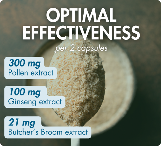 • Synergistic combination of 3 bio‑actives (Pollen, Ginseng and Butcher’s‑broom) and the exclusive micronutritional complex Suvimine 13®