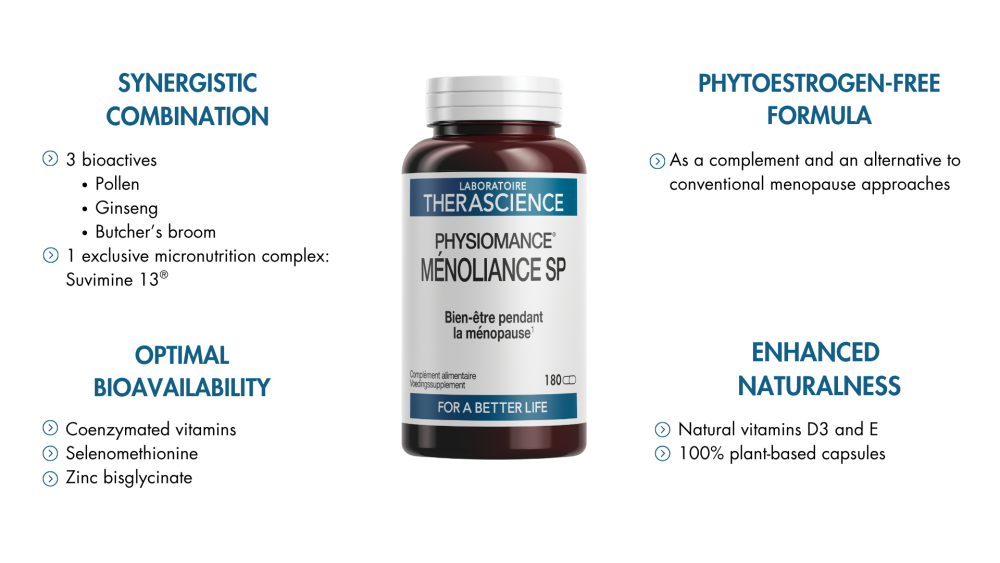 While hormone replacement therapy (HRT) may be an option, it is not always prescribed as a first-line treatment. For women sensitive to hormones or for whom this treatment is not suitable, hormone-free solutions are a particularly appealing alternative. They help target menopause symptoms by acting on other physiological pathways: supporting energy metabolism, protecting against oxidative stress, regulating hormonal activity through micronutrients, or improving circulatory comfort. This is precisely the positioning of PHYSIOMANCE® Ménoliance SP, a formula without phytoestrogens, whether as an alternative or a complement to other therapeutic approaches.