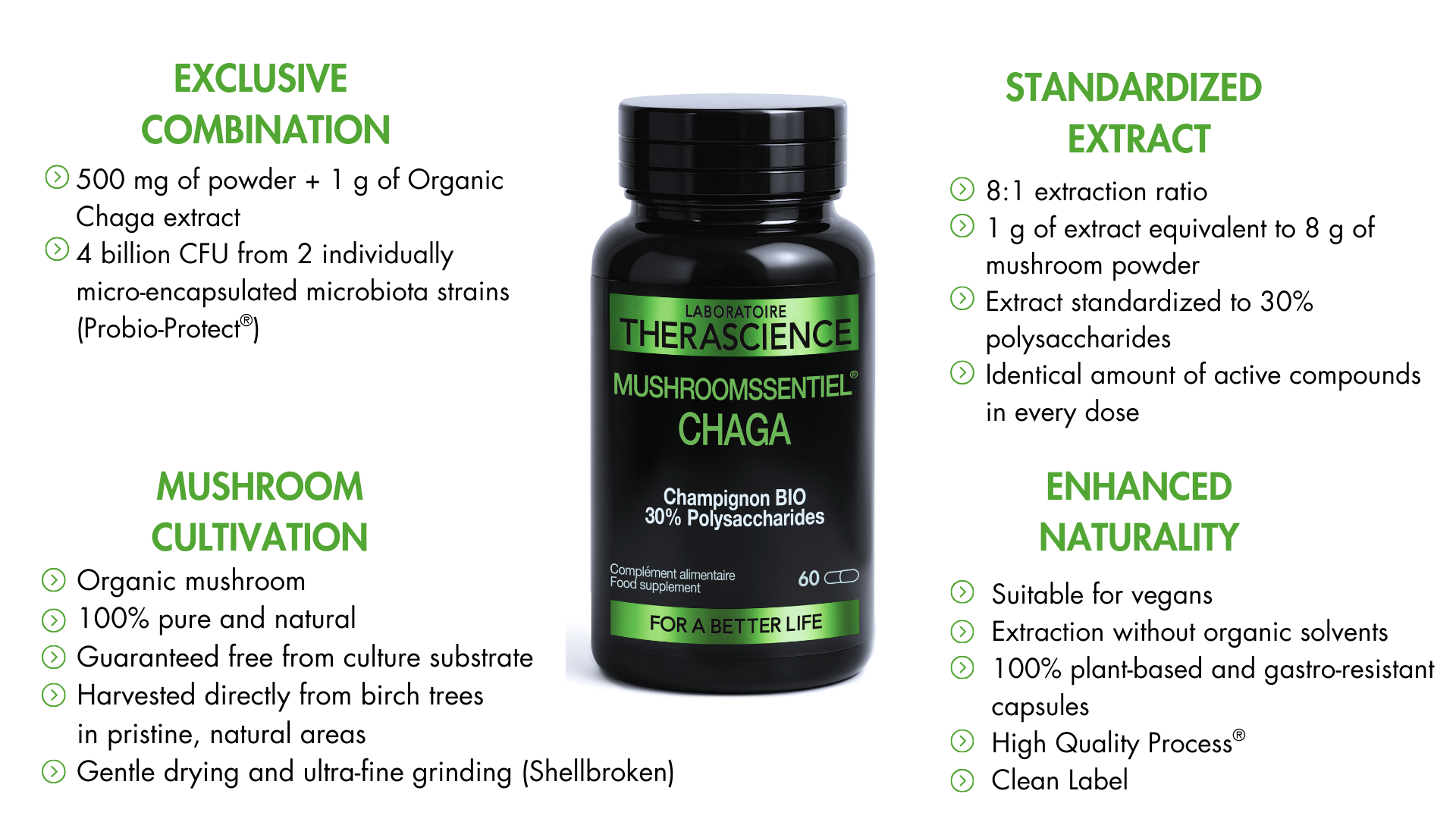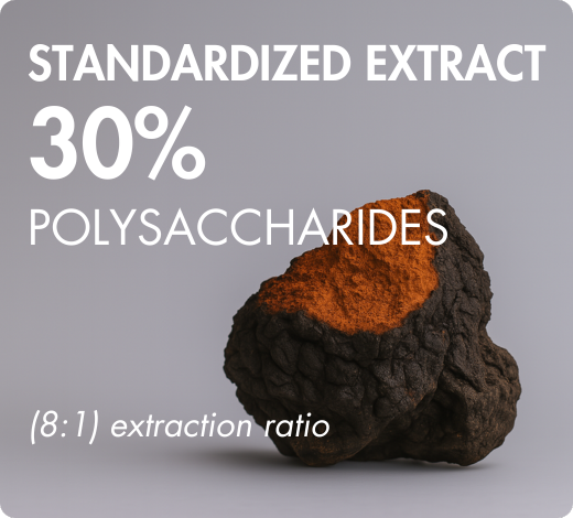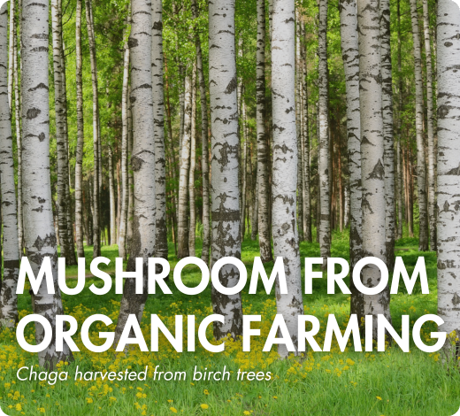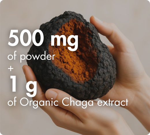The extraction of Chaga’s active compounds is performed without any organic solvents. Our extracts are obtained through a gentle water extraction process, during which the ground mushrooms are simmered for several hours at controlled temperatures, without boiling.