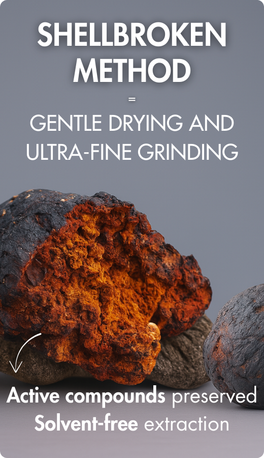 This technique mechanically breaks the cell walls of the mushroom, releasing all active compounds and significantly improving their bioavailability.