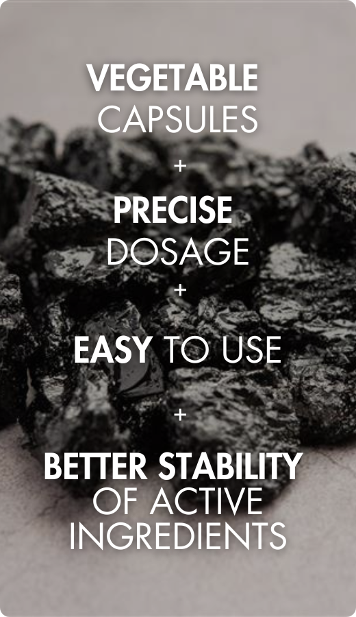 Unlike most Shilajits offered as resin to be diluted, which are often inconvenient and have an unpleasant taste, our Shilajit is formulated in plant-based capsules. This presentation ensures precise and consistent dosing with every intake, easy use without preparation, and better stability of active compounds, without risk of oxidation or contamination.