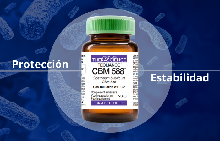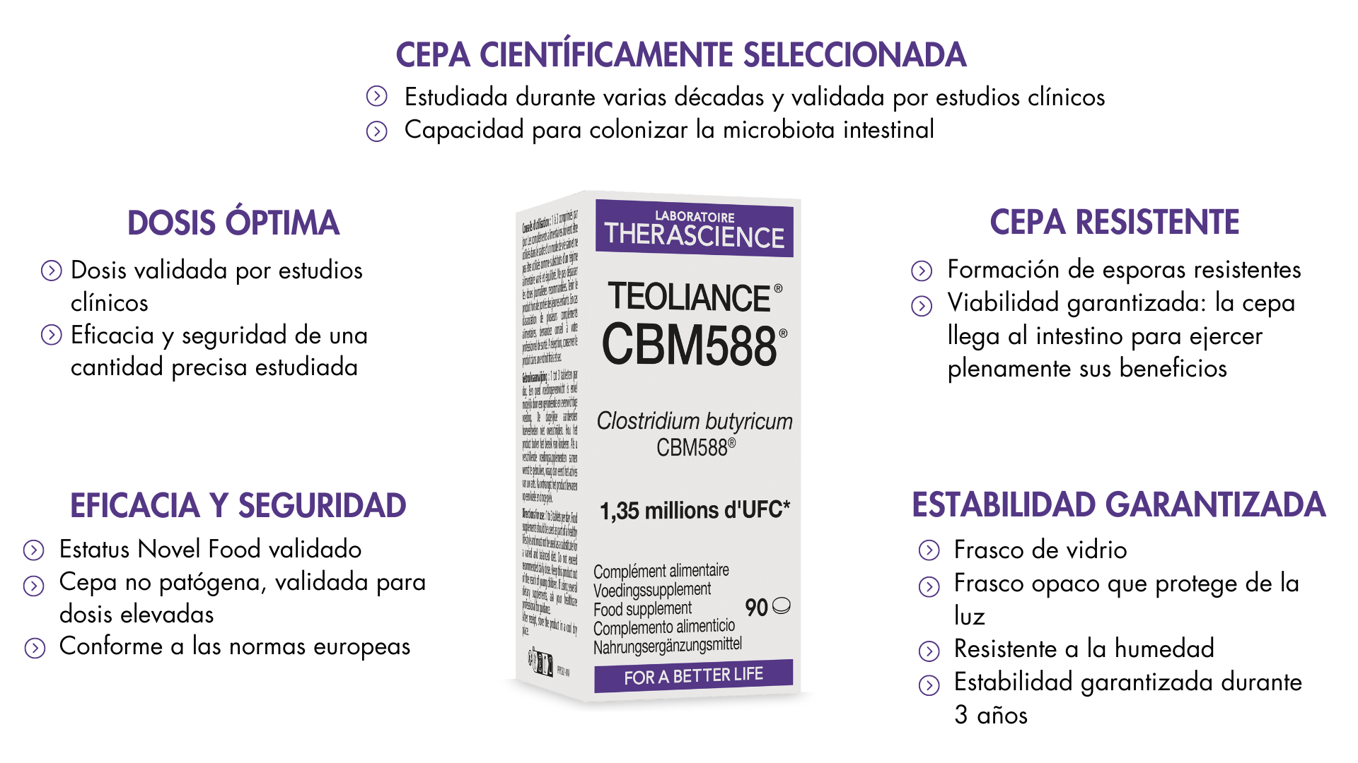 - Clostridium butyricum CBM588® : 1 cepa probiótica exclusiva, seleccionada científicamente por sus beneficios para la microbiota y la salud.
