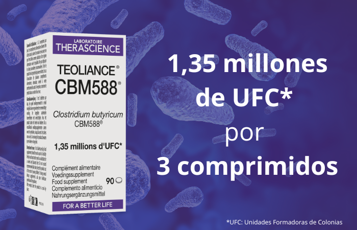 - 1,35 millones de UFC* de Clostridium butyricum CBM588® por 3 comprimidos;