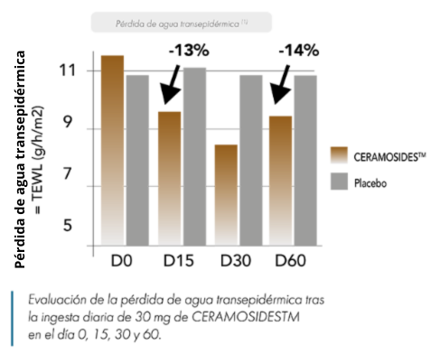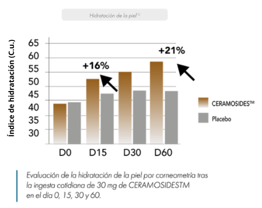 Un estudio clínico aleatorizado, doble ciego y controlado con placebo, realizado en 40 mujeres de 30 a 60 años, muestra un aumento de la hidratación de la piel del +16% y una reducción de la pérdida de agua transepidérmica del -13% tras 15 días de suplementación con 30 mg de CERAMOSIDES™ (1).