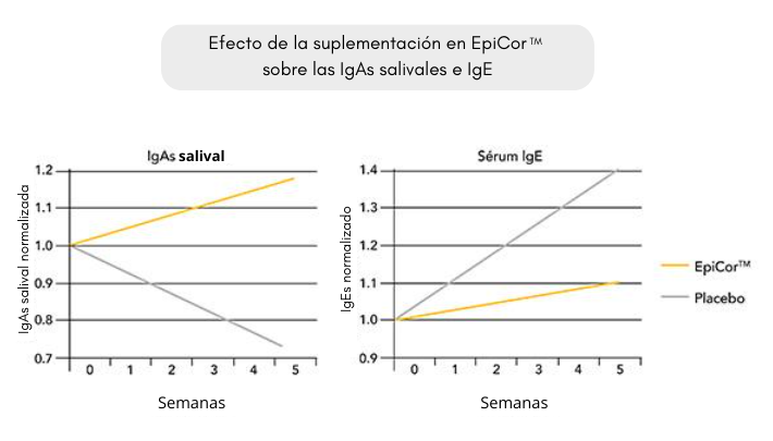Un estudio clínico doble ciego controlado con placebo realizado en primavera (estación propensa a las alergias) en 25 sujetos sanos demostró que, en comparación con el placebo, el postbiótico EpiCorTM equilibraba y mejoraba la respuesta inmunitaria reduciendo la IgE, un anticuerpo asociado a las alergias, al tiempo que aumentaba la IgA tras 5 semanas de suplementación diaria con 500 mg de postbiótico EpiCorTM. 5.