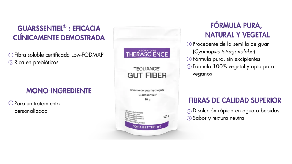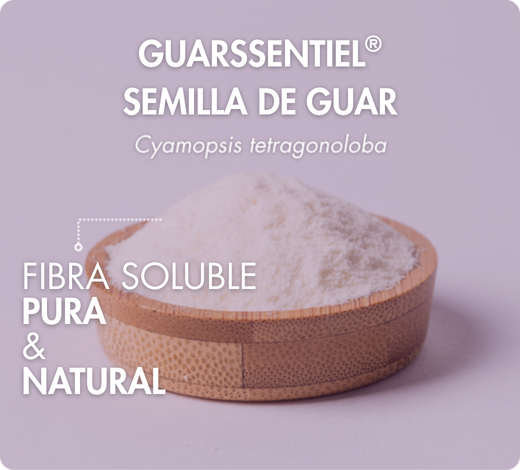 - GUARssentiel®: Fibras solubles, con eficacia clínicamente probada, certificadas con bajo contenido en FODMAP, gracias a una tecnología exclusiva de hidrólisis enzimática. Una vez ingeridas, son metabolizadas muy lentamente por las bacterias intestinales y son perfectamente toleradas por el intestino, incluso en dosis elevadas