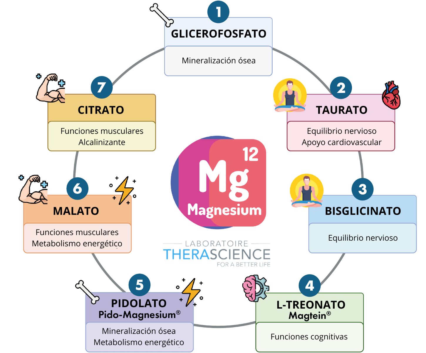 - Combinación exclusiva de 7 formas de magnesio, incluyendo Magtein® (L-Treonato) y Pido-Magnésium® (L-Pidolato), para maximizar los beneficios del magnesio
