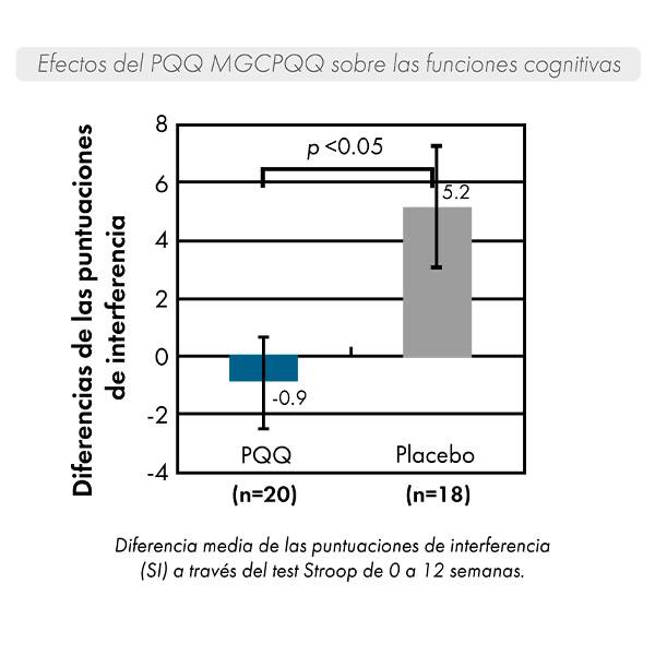 Un estudio aleatorizado, doble ciego y controlado con placebo, realizado en 38 pacientes sanos mayores de 50 años, mostró una mejora significativa en la atención selectiva (prueba de Stroop) después de 12 semanas de suplementación con 20 mg de PQQ MGCPQQ® al día1.