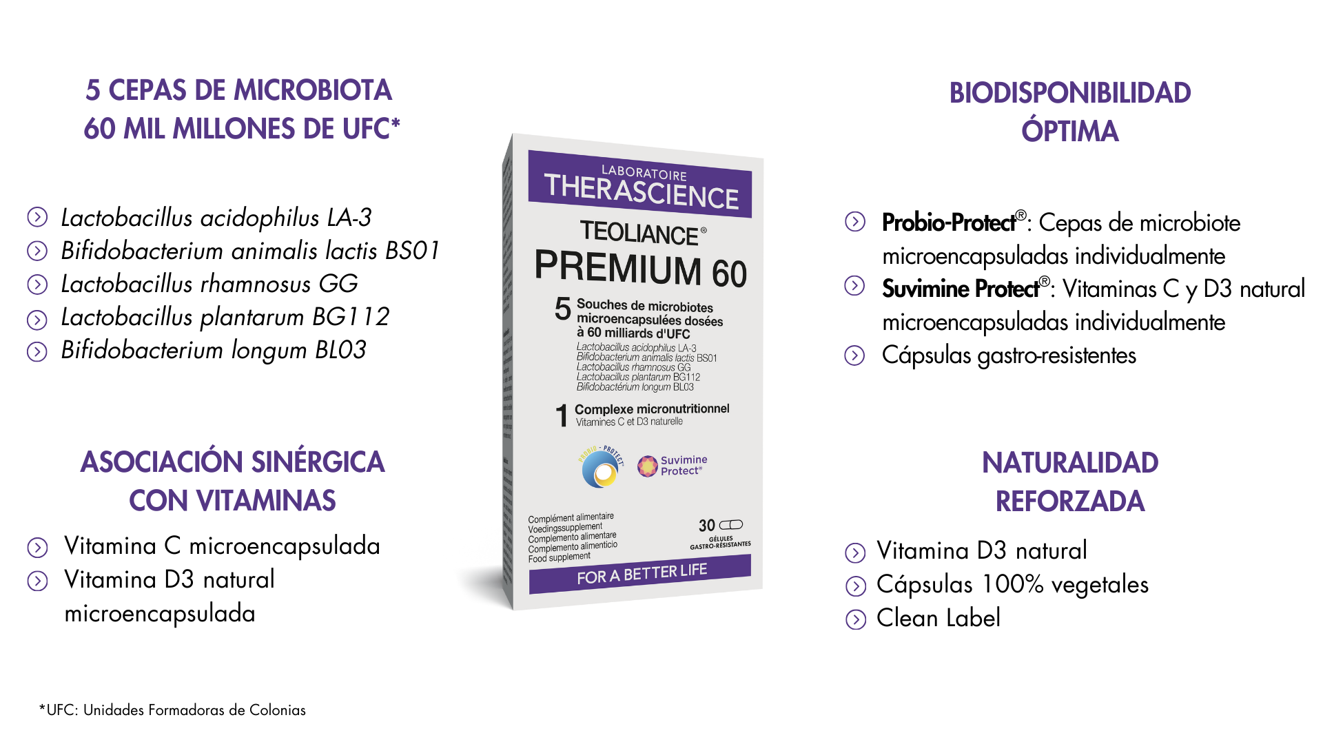 Gracias a esta combinación de cápsulas gastrorresistentes, microencapsulación Probio-Protect® de las cepas y microencapsulación Suvimine Protect® de las vitaminas, TEOLIANCE® Premium 60 se inscribe en un enfoque de formulación exigente, que combina biodisponibilidad controlada, estabilidad de los componentes y coherencia tecnológica, al servicio de un complemento alimenticio a base de cepas de microbiota diseñado según altos estándares de calidad y trazabilidad.