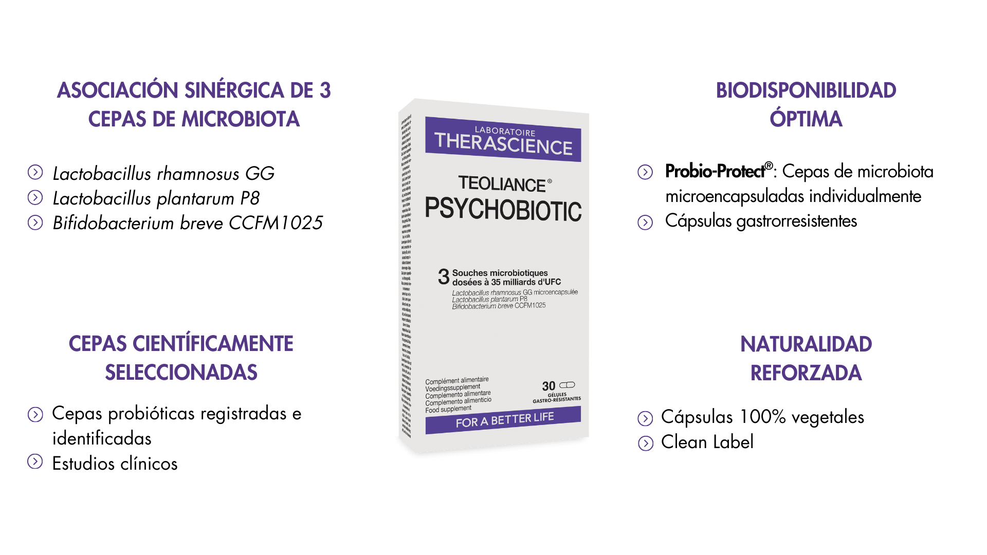 La fórmula de TEOLIANCE® Psychobiotic se basa en el uso de cápsulas gastrorresistentes, diseñadas para preservar la integridad de las cepas microbianas a lo largo del tránsito digestivo y permitir su liberación en el intestino, en consonancia con la fisiología de la microbiota intestinal.