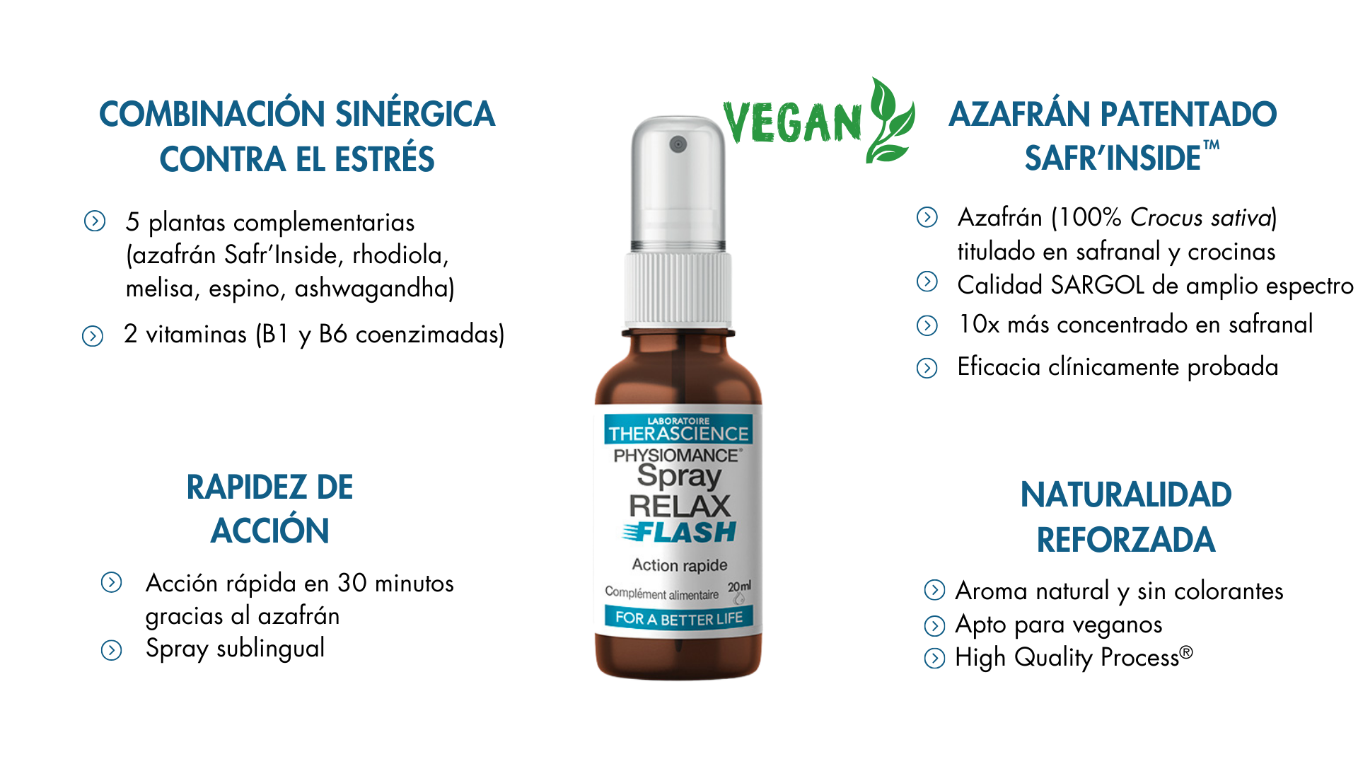 PHYSIOMANCE® Spray Relax Flash se distingue por su fórmula única a base de 5 principios activos naturales y 2 vitaminas, que proporcionan una acción rápida, ideal para reducir los efectos del estrés pasajero al tiempo que favorece el equilibrio emocional.