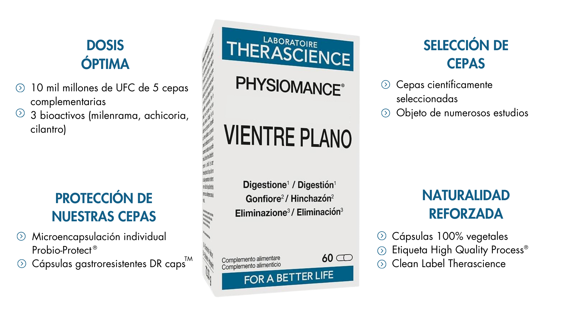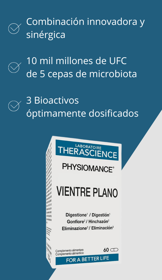 PHYSIOMANCE® Vientre Plano es una combinación sinérgica única de 5 probióticos y 3 bioactivos naturales con propiedades complementarias, ideal para ayudar a mantener una digestión normal, reducir la hinchazón, facilitar la eliminación y contribuir al adelgazamiento.
