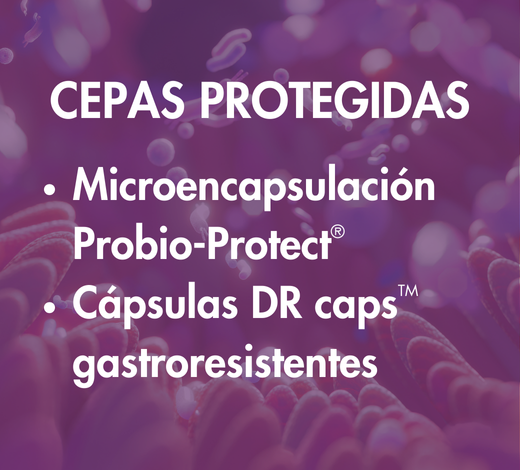 Nuestras 5 cepas de probióticos han sido seleccionadas científicamente por sus numerosos beneficios y su interés en la microbiota intestinal. Nuestra fórmula aporta 10.000 millones de UFC (Unidades Formadoras de Colonias) de estas 5 cepas, que incluyen Lactobacillus gasseri SP33, Lactobacillus acidophillus LA-3, Bifidobacterium animalis lactis BS01, Lactobacillus rhamnosus GG y Bifidobacterium bifidum SP9. Para garantizar una biodisponibilidad óptima, nuestras 5 cepas están microencapsuladas individualmente mediante el innovador proceso Probio-Protect®. Además, están envasadas en cápsulas DR capsTM 100% vegetales gastrorresistentes para preservar su acción a su paso por el estómago.