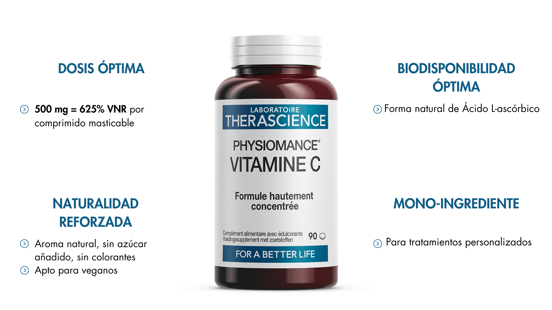 PHYSIOMANCE® VITAMINA C aporta 500 mg de vitamina C por comprimido masticable, lo que equivale al 625 % de los Valores Nutricionales de Referencia. Conforme a las exigencias del Laboratoire THERASCIENCE, este producto no contiene colorantes, aromas artificiales ni excipientes controvertidos. Está formulado con aromas naturales (naranja y limón) y sin azúcares añadidos. Es apto para veganos y no contiene ingredientes a base de lactosa ni gluten, ni nanopartículas, para una mayor naturalidad. Gracias a su formato masticable, PHYSIOMANCE® Vitamina C es apto para toda la familia y se puede integrar fácilmente en la rutina diaria.