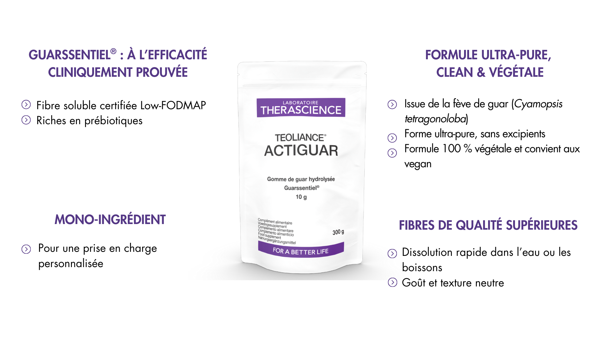- GUARssentiel®: Fibres solubles, à l’efficacité cliniquement prouvée, certifiées à faible teneur en FODMAP, grâce à une technologie exclusive d’hydrolyse enzymatique une fois ingérée, elles sont métabolisées très lentement par les bactéries intestinales et sont parfaitement tolérées sur le plan intestinal, même à des doses élevées