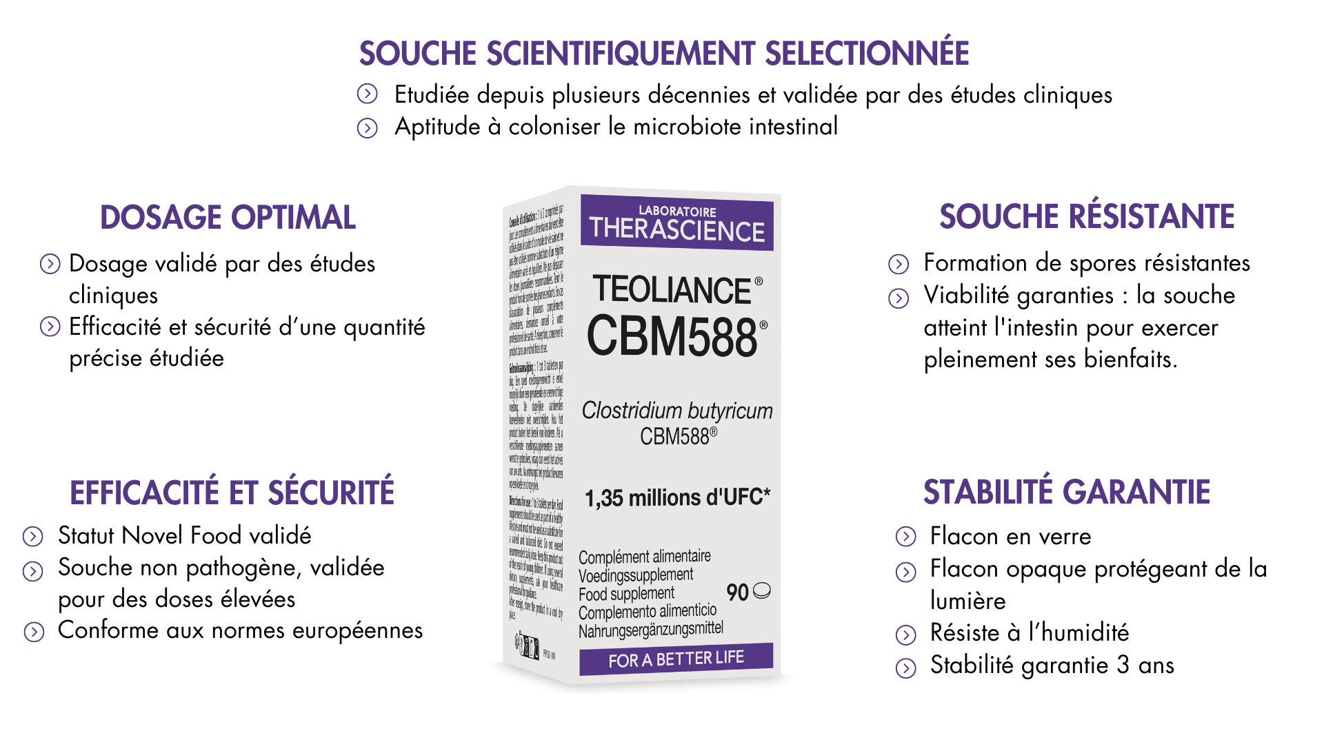 TEOLIANCE® CBM588® c’est un partenariat exclusif signé avec le Laboratoire japonais propriétaire de la souche. Ce partenariat garantit une exclusivité sur le marché français avec un dosage précis à 1,35 millions d’UFC* pour 3 comprimés. Il s’agit d’une souche spécifique et unique issue de décennies de recherches scientifiques rigoureuses. Ce produit, développé dans le respect des standards de qualité et de sécurité, s’intègre facilement dans votre routine quotidienne. *UFC : Unité Formant Colonie