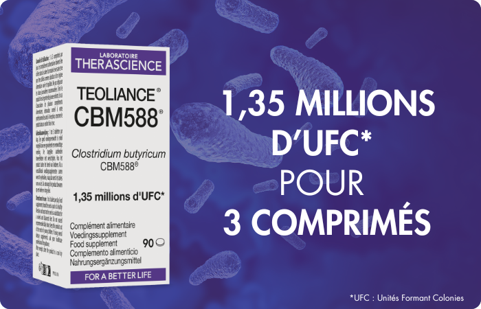 Teoliance® CBM588® est un complément alimentaire formulé à base d'une souche probiotique exclusive : Clostridium butyricumCBM588®. Les probiotiques sont définis comme des micro-organismes vivants qui, lorsqu'ils sont administrés en quantités adéquates, confèrent un bénéfice pour la santé de l'hôte. Ils ciblent les troubles liés à la santé digestive et à la flore intestinale, deux éléments fondamentaux pour un bien-être général. Les perturbations du microbiote intestinal, aussi appelées dysbioses, peuvent être associées à des pathologies variées, allant du Syndrome de l’Intestin Irritable (SII) à l’hyperperméabilité intestinale (HPI) ou encore aux Maladies Inflammatoires Chroniques de l’Intestin (MICI). Ces troubles peuvent entraîner une inflammation et une faiblesse de la barrière intestinale. Certains probiotiques assurent le bien-être intestinal et un équilibre intestinal optimal via un rôle indirect mais fondamental dans la production d’acides gras à chaîne courte (AGCC), comme le butyrate, naturellement produit par les bactéries du microbiote lors de la digestion, notamment par la fermentation des fibres alimentaires. Le butyrate ne se limite pas à son rôle local au niveau intestinal : il est crucial pour renforcer l’intégrité de la barrière intestinale, réduire les phénomènes inflammatoires et réguler les interactions entre le microbiote et le système immunitaire. Les probiotiques favorisent cette production en rééquilibrant la composition du microbiote, créant un environnement propice à l’activité des bactéries bénéfiques capables de métaboliser efficacement les fibres alimentaires.