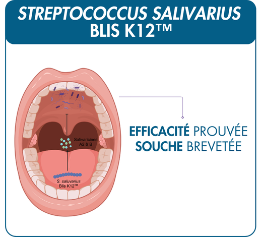 - - Streptococcus salivarius BLIS K12™, une souche probiotique brevetée, ayant fait l’objet de multiples articles scientifiques.