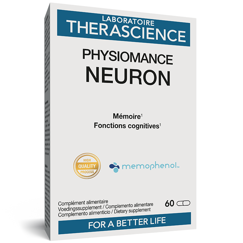 Offrez-vous le meilleur avec PHYSIOMANCE NEURON et sa formule certifiée SANS colorants, SANS ingrédients à base de gluten ni de lactose, non testée sur les animaux et fabriqué en Europe, grâce au Clean label THERASCIENCE. PHYSIOMANCE NEURON bénéficie de plus de l’actif breveté MémophénolTM, une formule dédiée à l’amélioration de la mémoire et des performances cognitives. Le label High Quality Process® certifie de plus la qualité, l'origine, et la sélection de nos extraits de plantes.