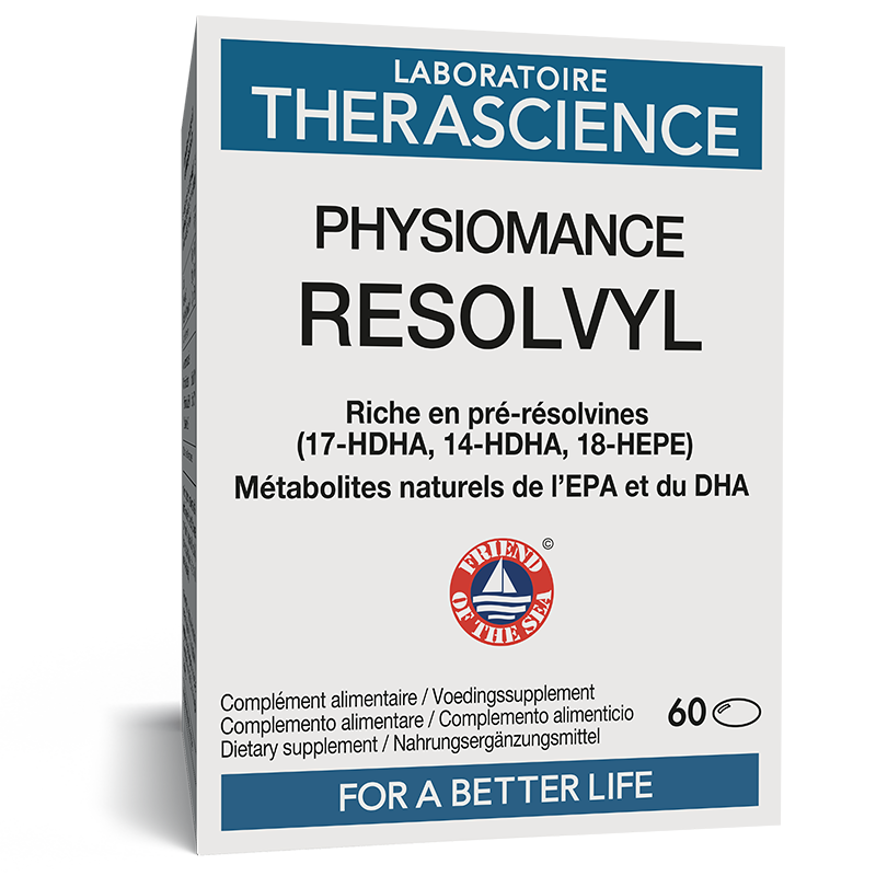 Notre formule PHYSIOMANCE RESOLVYL hautement concentrée en SPMs (340 µg par capsule), élaborée et développée par notre équipe Recherche et Développement en collaboration avec notre comité scientifique, a fait l'objet d'un travail approfondi afin de concevoir une solution idéale pour un apport nutritionnel de pré-résolvines (17-HDHA, 18-HEPE et 14-HDHA) et d’acides gras oméga-3 EPA et DHA.