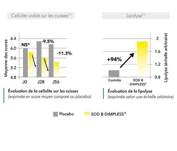 (1) Lemaire B et al., Etude clinique d’une superoxyde dismutase de melon naturelle et bioactive (SOD B dimpless®) sur la cellulite, phytothérapie, 2015.