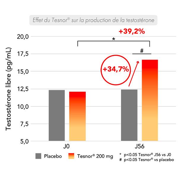 Une étude clinique randomisée, en double-aveugle versus placebo, réalisée auprès de 75 hommes âgés de 36 à 55 ans, a mis en évidence qu’une supplémentation quotidienne de 200 mg de Tesnor® pendant 56 jours augmente significativement la concentration en testostérone libre de 39,2% par rapport à J0 ; et de 34,7% par rapport au placebo 1. Ainsi, l’extrait de grenade et de cacao Tesnor® est un booster naturel de la testostérone.
