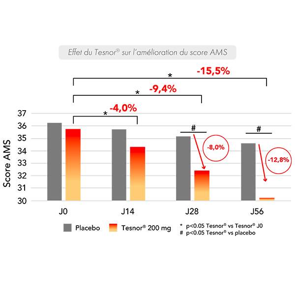 Dans cette même étude, l’efficacité du Tesnor® a été auto-évaluée au travers du questionnaire de référence Aging Male Symptoms (AMS) qui aide au diagnostic du déficit en testostérone (diminution de la force musculaire, du désir sexuel, du nombre d’érections,...). Plus le score de l’AMS est élevé, plus les déficits en testostérone sont importants (1). La supplémentation avec 200 mg de Tesnor® permet une amélioration significative de l’AMS : par rapport à J0 : -9,4% à J28 et -15,5% à J56, par rapport au placebo : -8,0% à J28 et -12,8% à J56.
