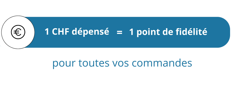 Dès que vous atteignez un palier de 200 points, vous bénéficiez de votre remise fidélité de 10 CHF qui seront déduits automatiquement de votre prochaine commande.
