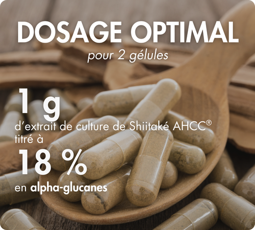 De plus, MUSHROOMSSENTIEL® AHCC® se distingue par un dosage précis à 18% en alpha-glucanes (molécules actives), ce qui représente 180 mg pour 2 gélules.