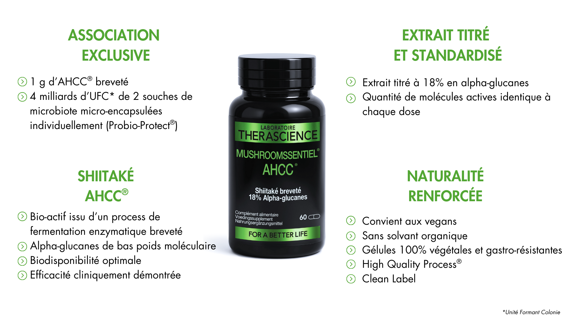 La Laboratoire THERASCIENCE ’extrait standardisé de culture de Shiitaké (Lentinula edodes) AHCC®. MUSHROOMSSENTIEL® AHCC® apportent pour 2 gélules, 1 g d’extrait de culture de Shiitaké AHCC®, permettant ainsi à notre formule d’être hautement concentrée.