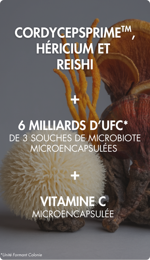 est une association unique et synergique de 3 extraits de champignons issus de l’agriculture biologique, de 3 souches de microbiote et de vitamine C.